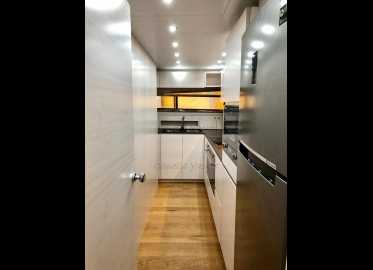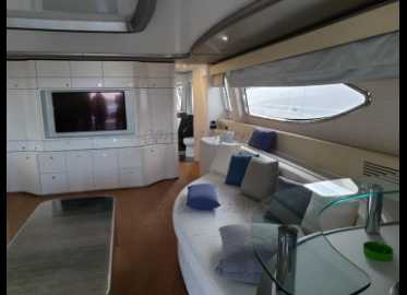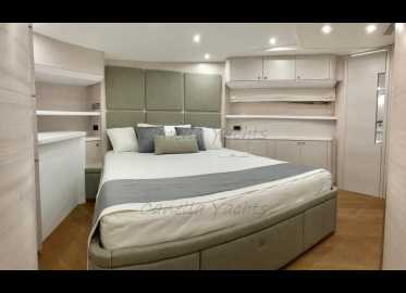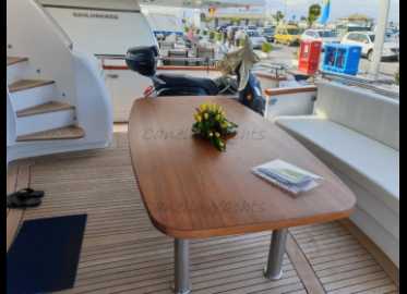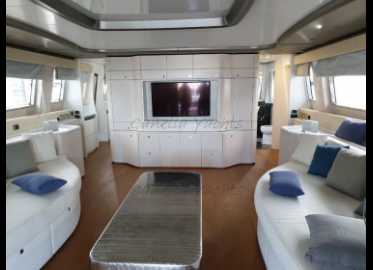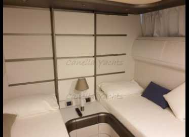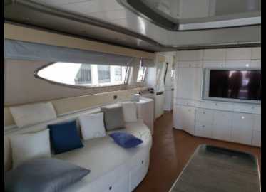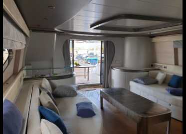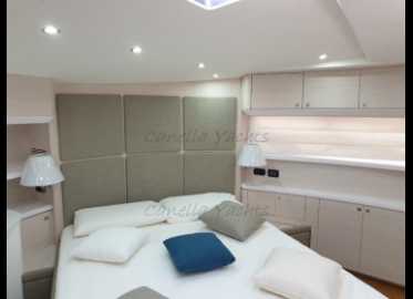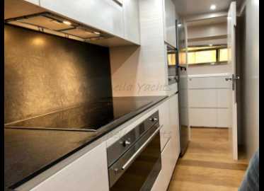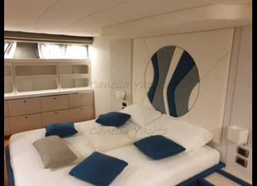The salon feature two sofas with coffee tables and a large TV screen. Salon lounge is separated from the dining area fitted with table seating eight charter guests. Forward, there is the large galley, conceived for long cruises with large storing space and well equipped for professional chef. Below deck astern is full beam Master stateroom with en suite bathroom , small sofa and vanity. Forward there are two twin-bed cabins with en suite bathrooms and, near the bow below office, is the VIP stateroom. All cabins are equipped with Air Conditioning